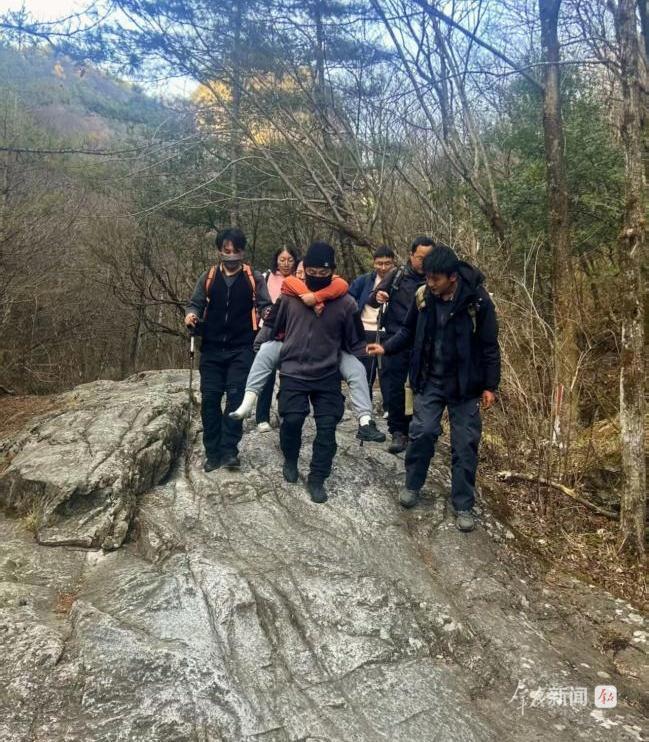 景區(qū)工作人員輪流背傷者下山
